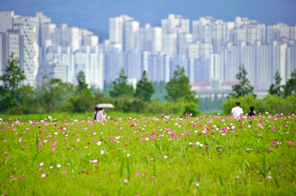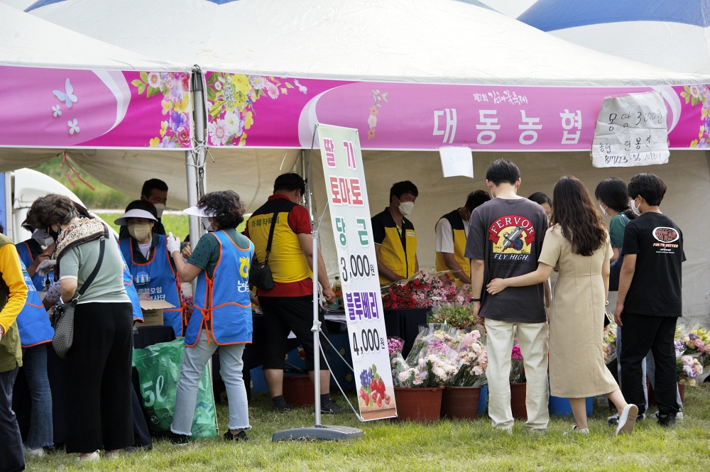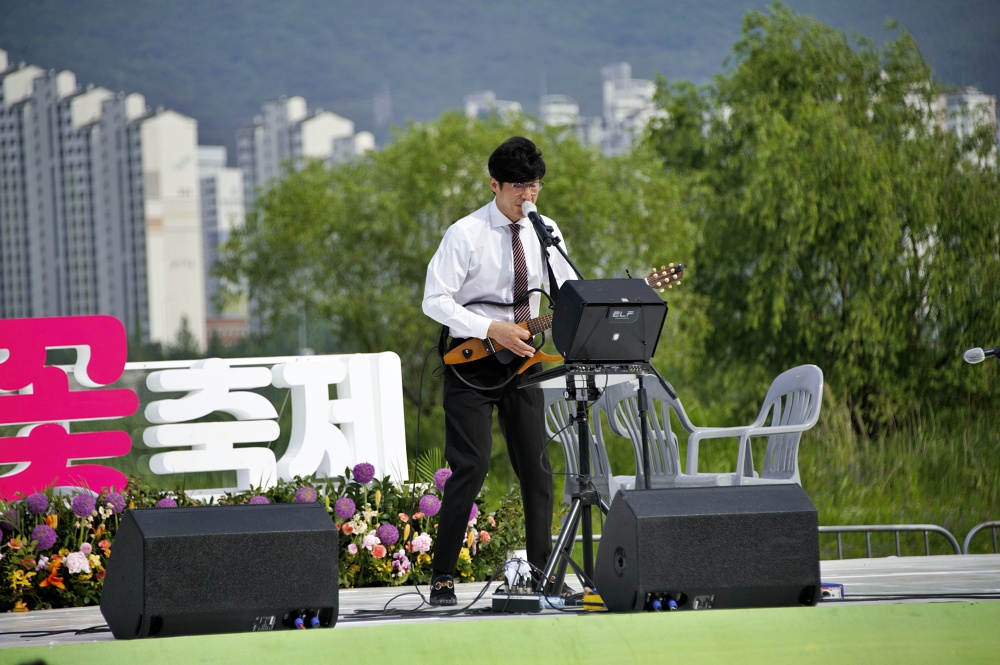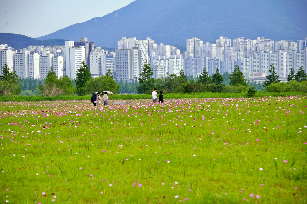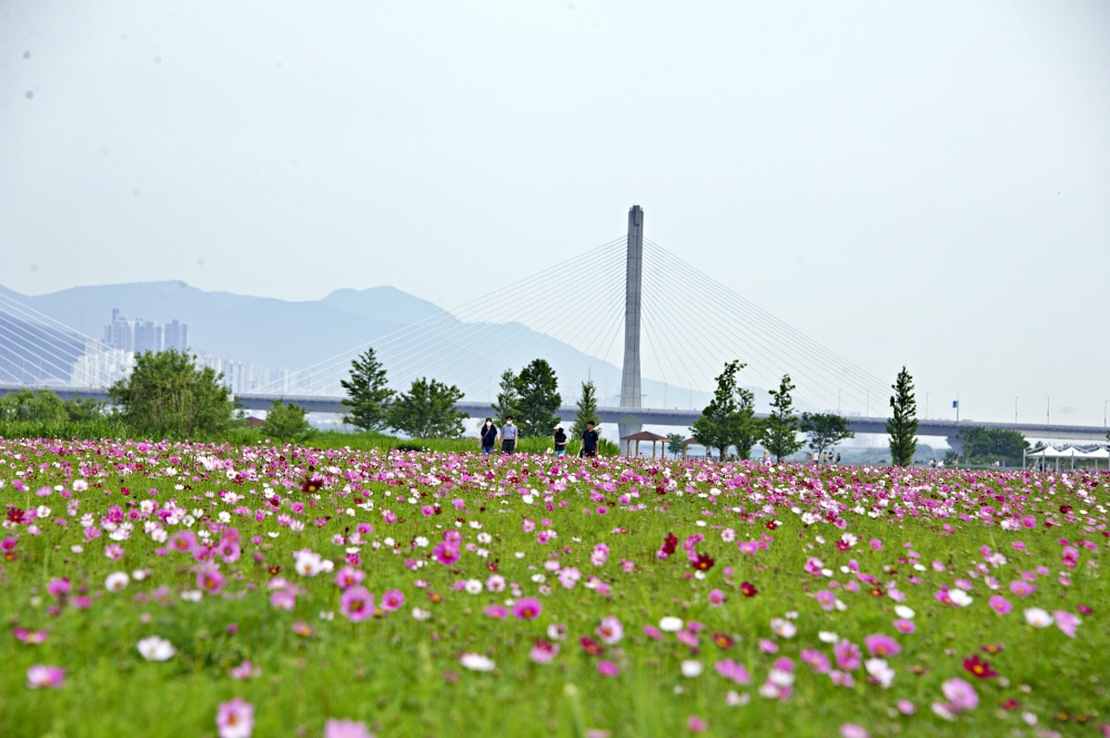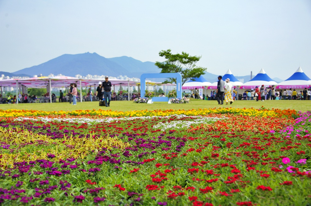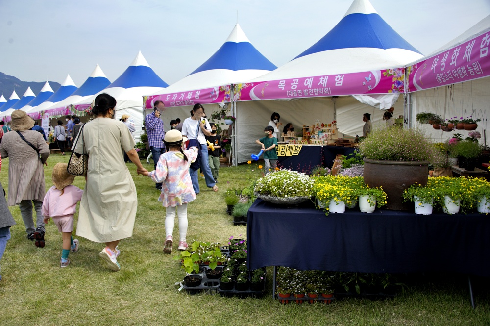 축제는 크게 세 가지 형태로 나누어집니다. 먼저 부스를 통한 화훼농가의 체험과 화훼 관련 판매가 있고요. 두 번째는 가수를 초청해 노래하는 무대가 따로 있습니다. 그런데 사람들은 꽃구경 가서 가수 노래를 잘 듣지 않는 것 같더라고요. 마지막 세 번째는 부스를 벗어나면 2km 정도 되는 드넓은 곳에 꽃이 심겨 있습니다. 중간 야생화 부분은 아직 다듬고 있습니다. 코스모스 단지와 마지막 야생화 단지에 꽃이 많습니다.
