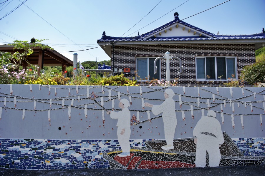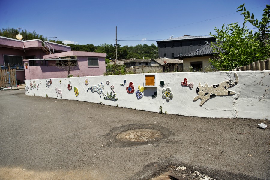 마을 곳곳은 낙화놀이 장면을 담은 곳도 있고, 다양한 풍경은 벽화로 만들었다. 벽화는 일반 페인트가 아니다. 타일을 색깔별로 구분하여 붙여 놓은 것이다.