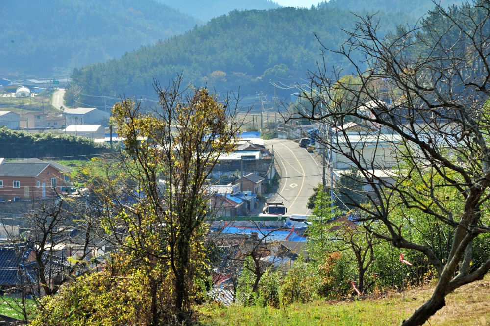 마을 뒷산에 보니 마을이 한눈에 들어오지는 않지만 큰 그림이 그려진다. 앞에 보이는 길은 내저 옹암으로 가는 국도다.