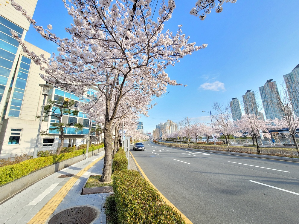 4월 1일, 난 좌수영로를 택해 걸었다. 벚꽃아 작은 아니지만 만발하기 일보 직전이라고 해야 하나. 하여튼 파란 하늘과 새하얀 벚꽃은 보기만 해도 탄성이 절로 나오게 했다. 수영강변을 끼고 돌아가는 수영로는 수영교부터 시작하여 원동 IC까지 이어진다. 난 이 길이 참 좋다.